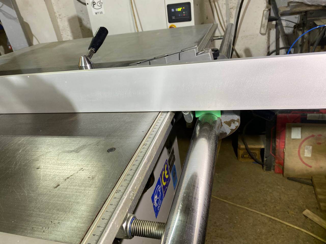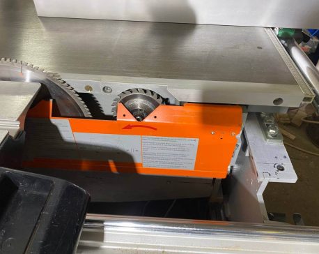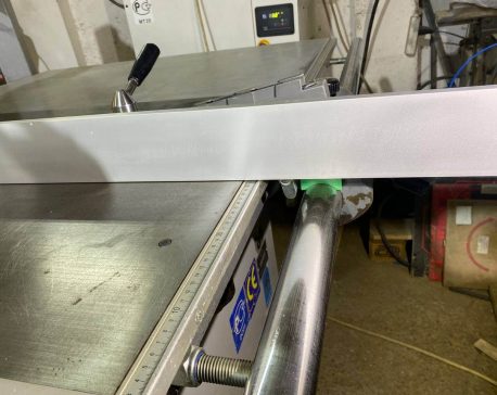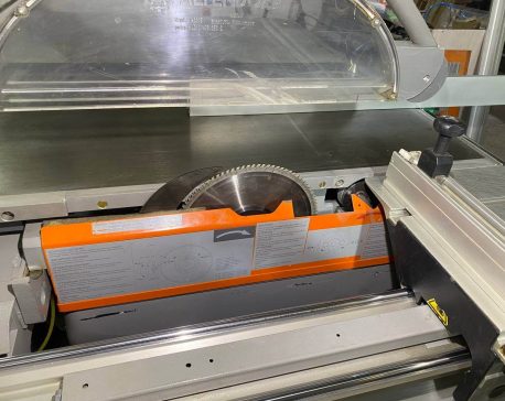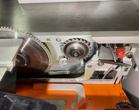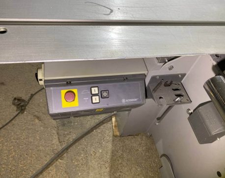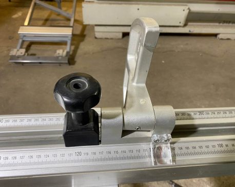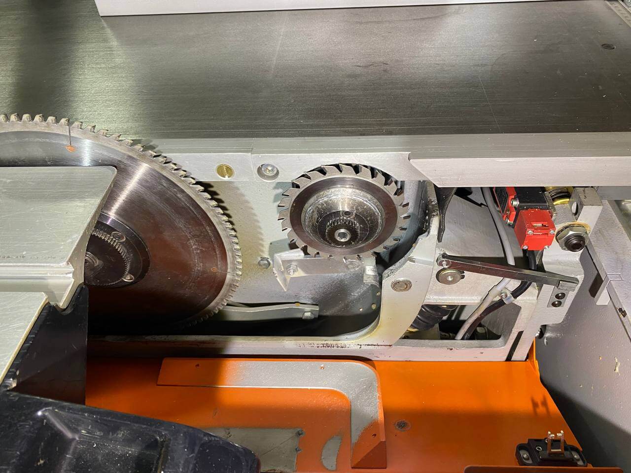 На ручке-толкателе двух роликовой каретки находятся четыре кнопки для включения и выключения основного пильного диска и подрезателя. Это очень практично, так как кнопки всегда под рукой, и оператору не нужно совершать лишних переходов у станка. К тому же повышается безопасность работы. Управлять пильным диском и подрезным узлом можно попеременно, как с пульта, так и посредством кнопок на каретке, без каких-либо особых «переходных» переключений.